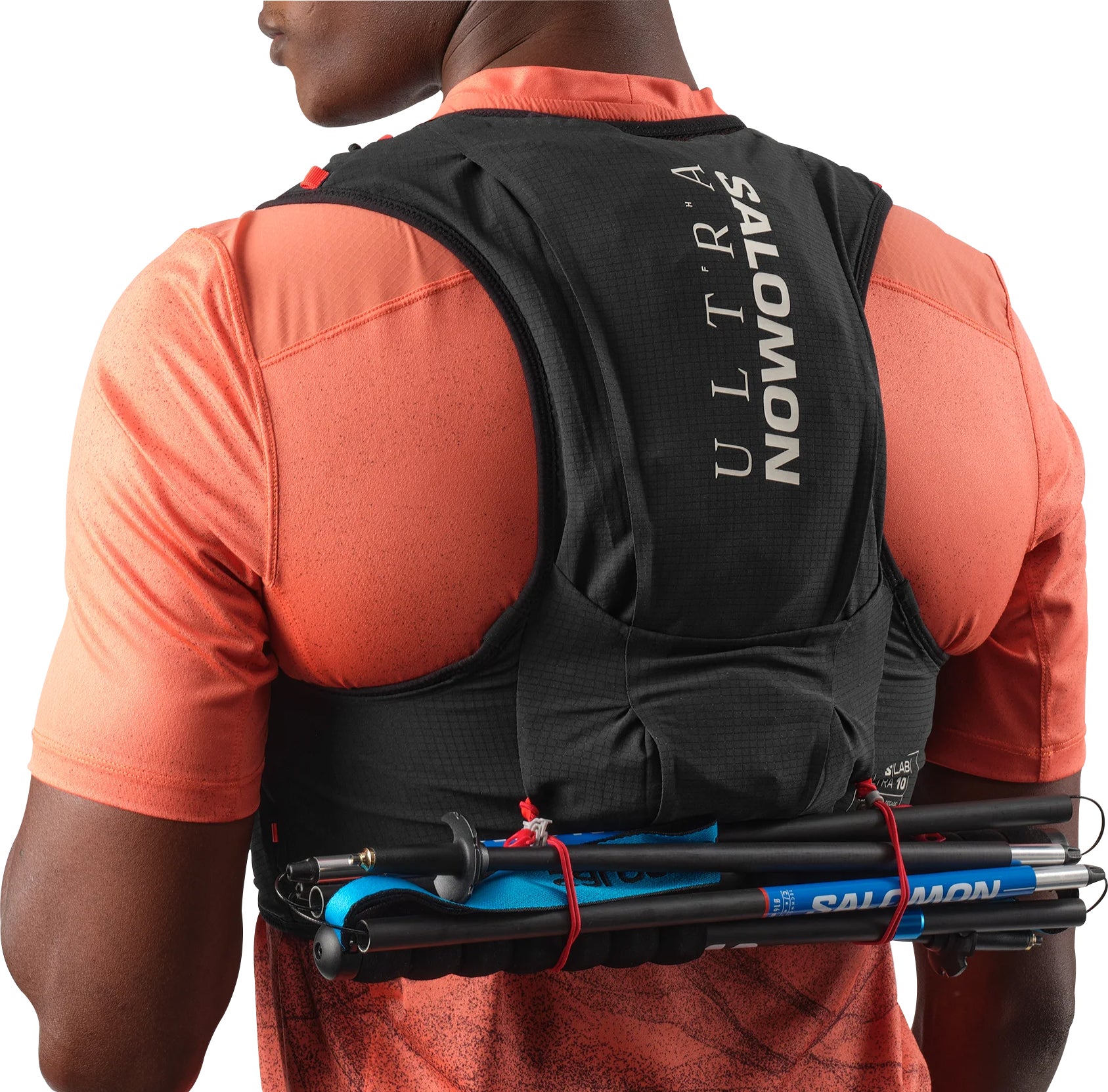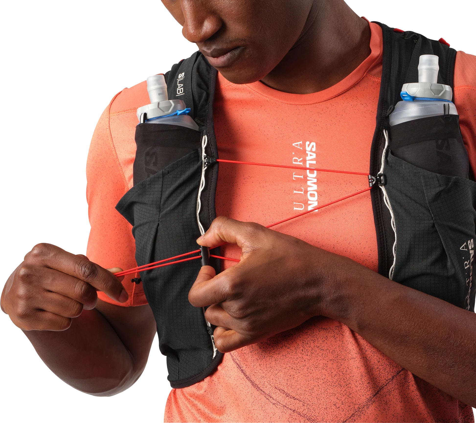 - 2 front flask pockets - Designed to fit Salomon soft flasks, these front pockets limit bouncing. Top elastic loops secure your flasks and keep them ready to drink.