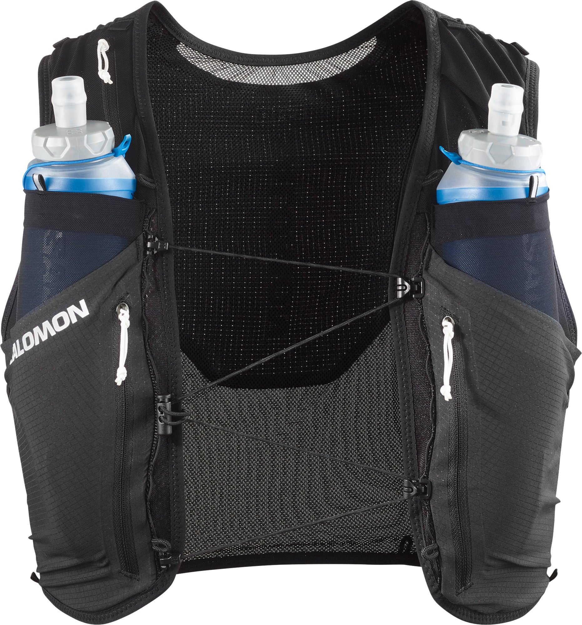 - 2 front flask pockets - Designed to fit Salomon soft flasks, these front pockets limit bouncing. Top elastic loops secure your flasks and keep them ready to drink.