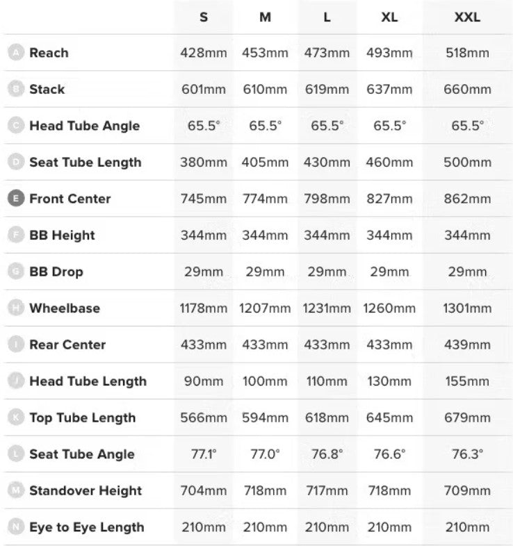 Chainstay length and seat angle is matched to the frame size so every rider, no matter their height, gets the same balanced geometry. Across all sizes however, the headtube angle has been slackened to help stability at speed, lowered the bottom bracket to compliment the better supported suspension, and increased stack in favor of modern handlebar setups.