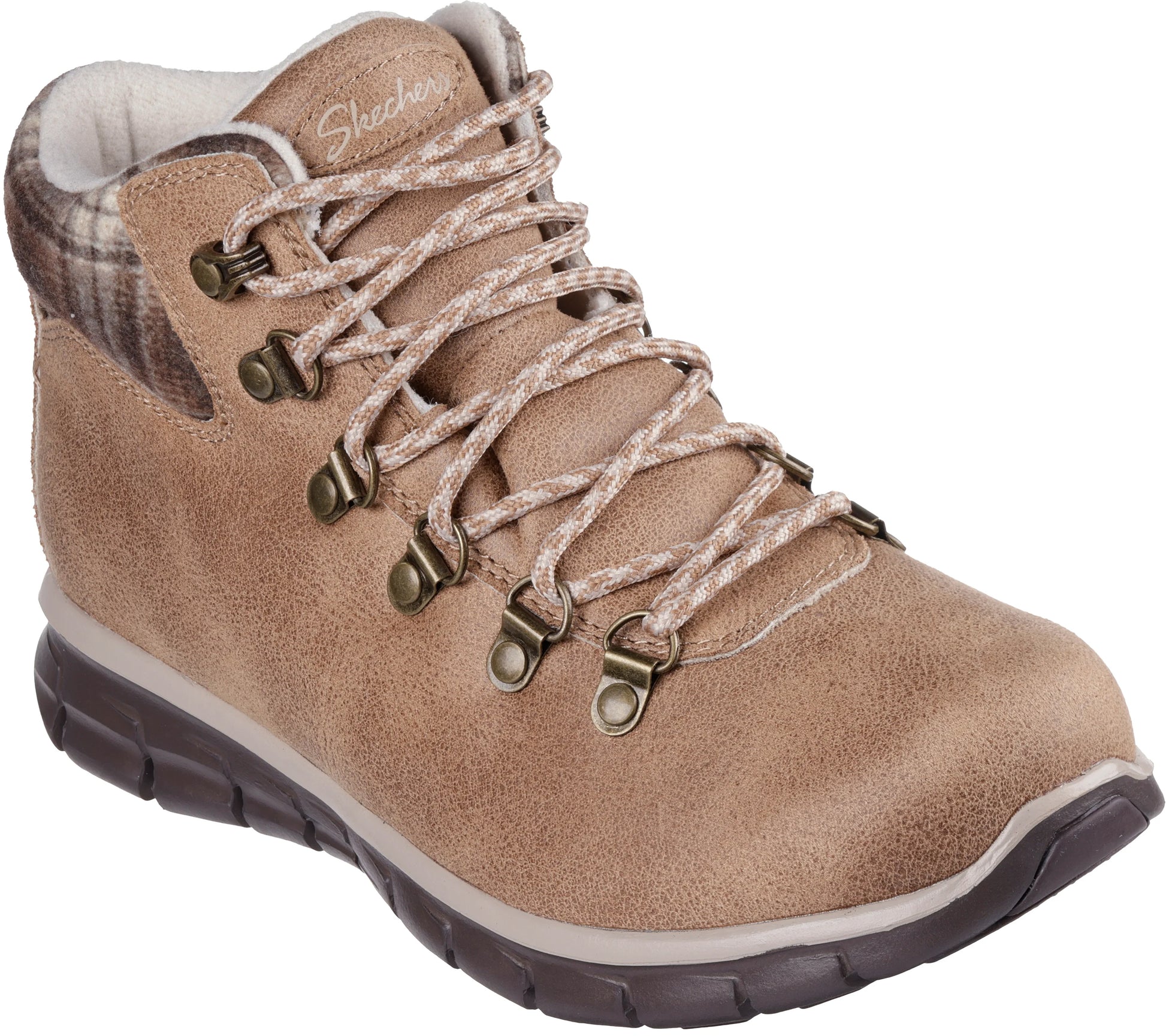 Chilly weather style meets sporty comfort in Skechers Synergy - Plaid Mood. This lace-up hiker style features a water-repellent microleather fabric upper with a plaid-sweater knit trim, faux-fur lining, cushioned Warm Tech Memory Foam insole and a slip-resistant outsole.