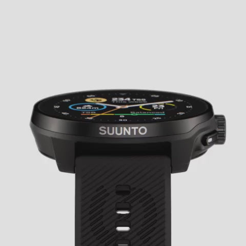 The watch design derives from the original Suunto Race with its shape, crown button, and AMOLED display. With the bright high definition touch screen, the display is super sharp even in fast situations and sunlight.