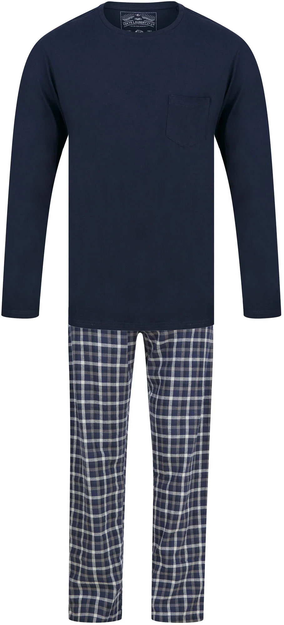 Transition seamlessly into your bedtime routine with the 'Glencoe' 2pc long sleeve cotton checked lounge set in sky captain navy by Tokyo Laundry. This classic pyjama set offers the perfect blend of style and comfort, making your nights as relaxing as they are stylish. Crafted from soft cotton jersey material, this lounge set envelops you in a gentle embrace, ensuring utmost comfort as you unwind. Elevate your loungewear experience with a hint of pattern – the checked brushed flannel bottoms feature a straight-legged design, enhanced by an elasticated waistband and adjustable drawcords for a personalized fit.