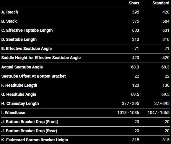 The "Standard" size is best for riders looking to sharpen their skills at the pumptrack, or prefer a more stable geo for bigger jumps and higher speeds without sacrificing the playfulness of the short rear end. This size has the same 377 - 395 mm chainstay length as the short, and is paired with a 420 mm reach.